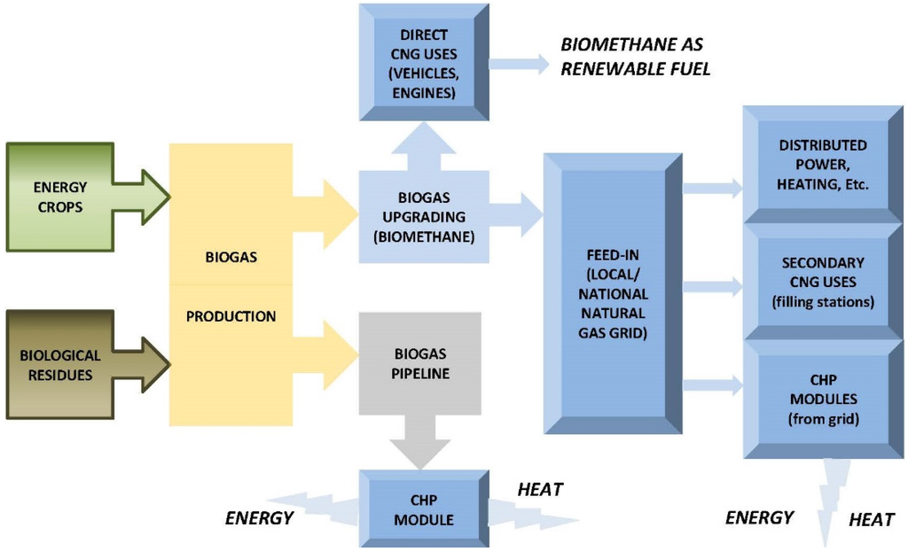 After generation and clean-up, biogas can be used in several ways, schematized in Figure 2: