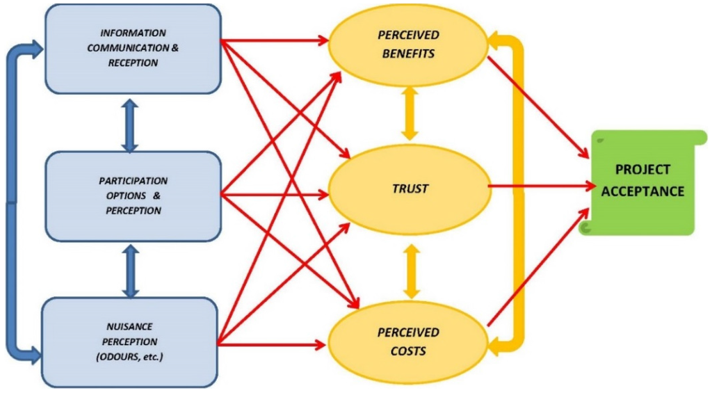 Application of the model showed that this tool proves to be a reliable method for identifying correlations between discriminating factors influencing local acceptance, allowing a detailed analysis of how different issues such as trust, perceived benefits and costs, information, and participation influence each other in the process, and identifying the most sensitive ones in each situation.