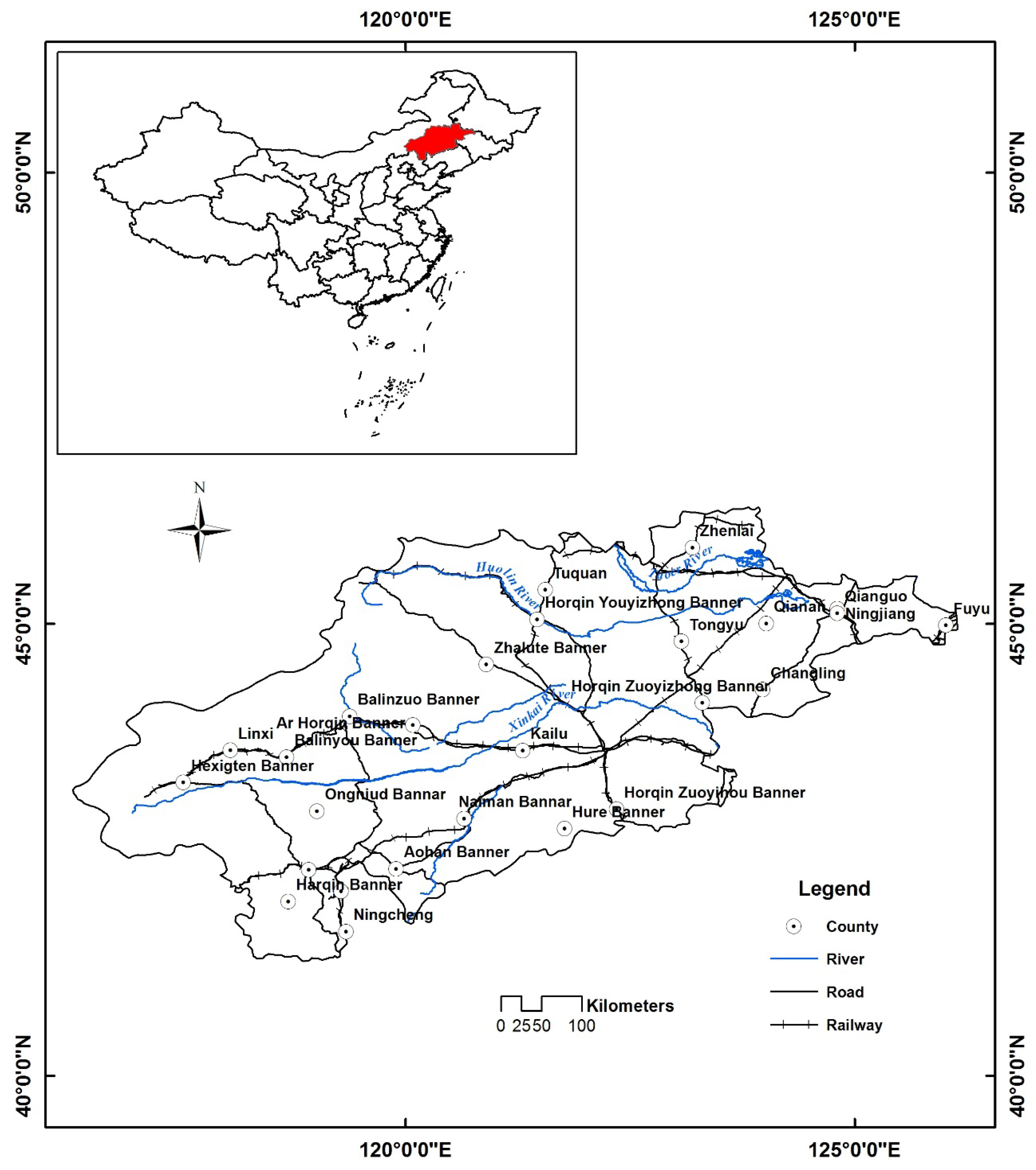 The west of Songliao Plain is located in 121°38′–126°11′E, 43°22′–46°18′N, covering an area of about 216,871 km2 (Figure 1). It is characteristic of temperate continental semi-arid monsoon climate, with windy and dry winters and springs, and warm and comparatively wet summers, followed by short and cool autumns [30]. Based on the meteorological data between 1953 and 2010 from 14 weather stations in this region for the years, the average annual temperature ranges from 4.3 °C (Sanchahe station) to 7.3 °C (Chifeng station). Mean annual precipitation varies from 321 mm (Changling station) to 516 mm (Sanchahe station), with most precipitation occurring between June and August. Annual mean evaporation in this region is 4–6 times annual rainfall. For instance, the average annual precipitation of Chifeng is about 370 mm, while the average evaporation reaches 2029 mm [31]. The probability of spring drought occurrence is 50%–80%, and autumn and summer drought 15%–35%. Soil types include chernozem, chestnut soil, sandy soil, meadow soil and saline-alkali soil. The natural vegetation is mainly composed of Leymus chinensis, Stipa grandis and Agropyron cristatum, Salix flavida, Cleistogenes, Calamagrostis epigeios, and Iris lacteal communities with sparsely scattered woods (mainly Ulmus pumila). The original vegetation has greatly changed during the past several decades, mainly due to long-term overgrazing and over cultivation. Since the mid 1970s, some desertification controlling efforts, such as placing sand arresters (straw checkerboards), planting the indigenous trees, shrubs and grasses adaptive to sandy land, and fencing grassland against grazing, have been carried out in some parts of the region [32]. Administratively, the studied area encompasses 30 banners (counties or cities) in Inner Mongolian Autonomous Region and Jilin Province. The total population increased by 4.38% from 12,797,900 in 1999 to 13,358,889 persons in 2011. In this fragile area of northern China, the livelihood for the majority of the population depends on agriculture and livestock husbandry. In recent years, several large ecological restoration programs have been implemented including the “Grain for Green Project” since 1999 [33] and the “Beijing and Tianjin Sandstorm Source Controlling Project” since 2000 [26], which have been led to the improvements of sand dune area in some counties.