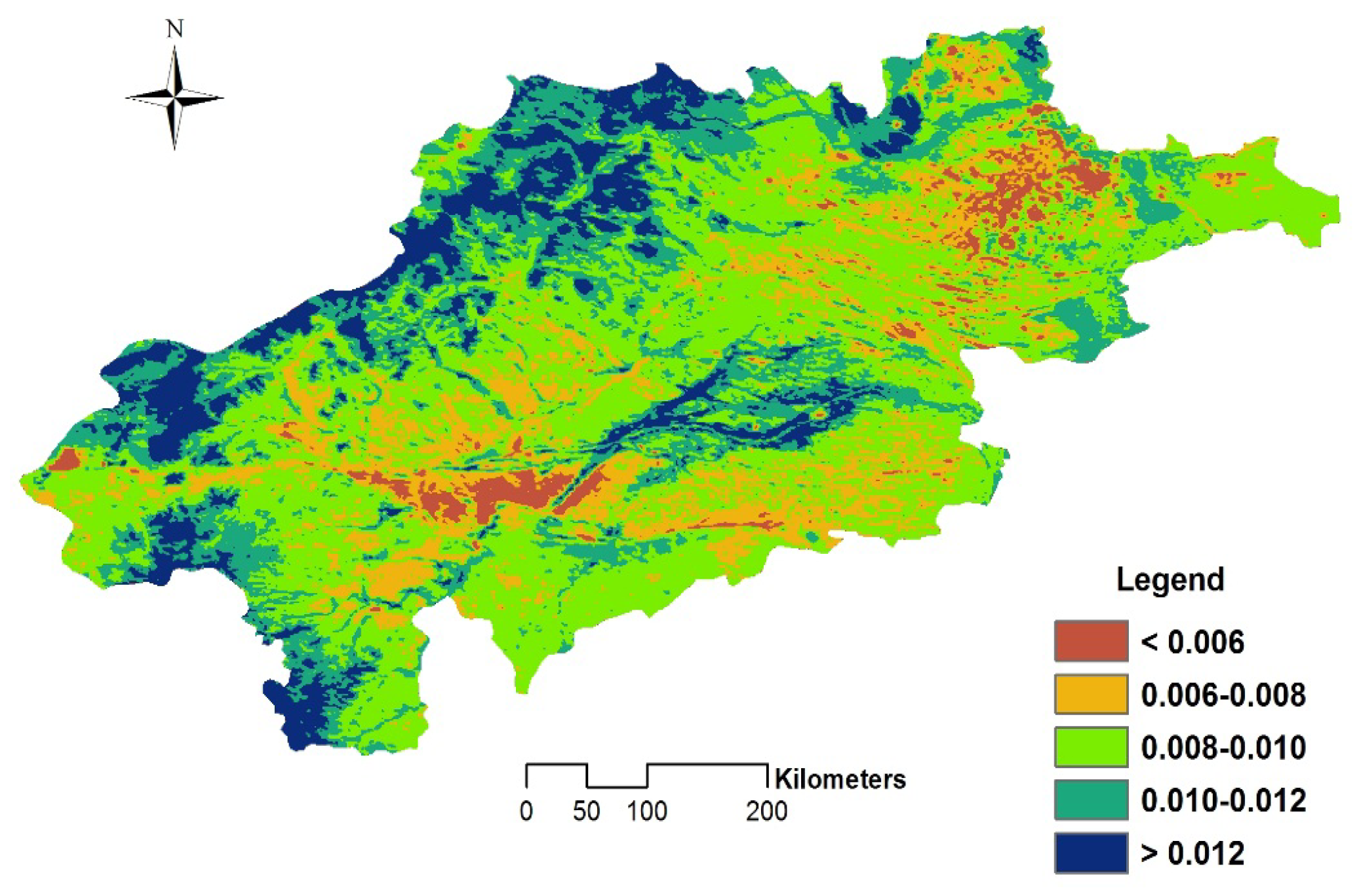 RUE trends for each pixel were estimated according to a linear relationship with years as independent variable. During the period from 1999 to 2011, the spatial pattern of vegetation change varied (Figure 3). Of the total area, 59.53% experienced a RUE increase, while the area with a negative SLOPE occupied the rest of the area. The common interpretation is that statistically significant negative slopes indicate land degradation. Conversely, positive slopes may imply improved ecosystem function.