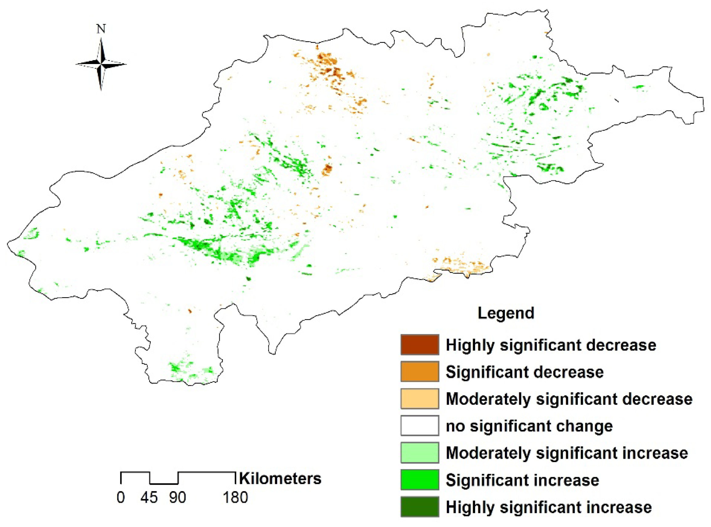 where SLOPE is the slope of the fitted regression line of the growing season RUE at each pixel, n represents year range, and i is 1 for the first year, 2 for the second year, and so on. A negative regression coefficient (SLOPE < 0) indicates a decline of RUE, thereby implying vegetation degradation. A positive value (SLOPE > 0) depicts an increase trend of RUE from the first to the last year, which suggests improved vegetation activity. F-statistics were used to determine the significance of linear regression models. According to the SLOPE value and significant levels, the change trends of RUE are classified into seven types: (1) highly significant decrease (SLOPE < 0, p ≤ 0.01); (2) significant decrease (SLOPE < 0, 0.01 < p ≤ 0.05); (3) moderately significant decrease (SLOPE < 0, 0.05 < p ≤ 0.1); (4) no significant change (p > 0.1); (5) moderately significant increase (SLOPE < 0, 0.05 < p ≤ 0.1); (6) significant increase (SLOPE > 0, 0.01 < p ≤ 0.05); and (7) highly significant increase (SLOPE > 0, p ≤ 0.01).