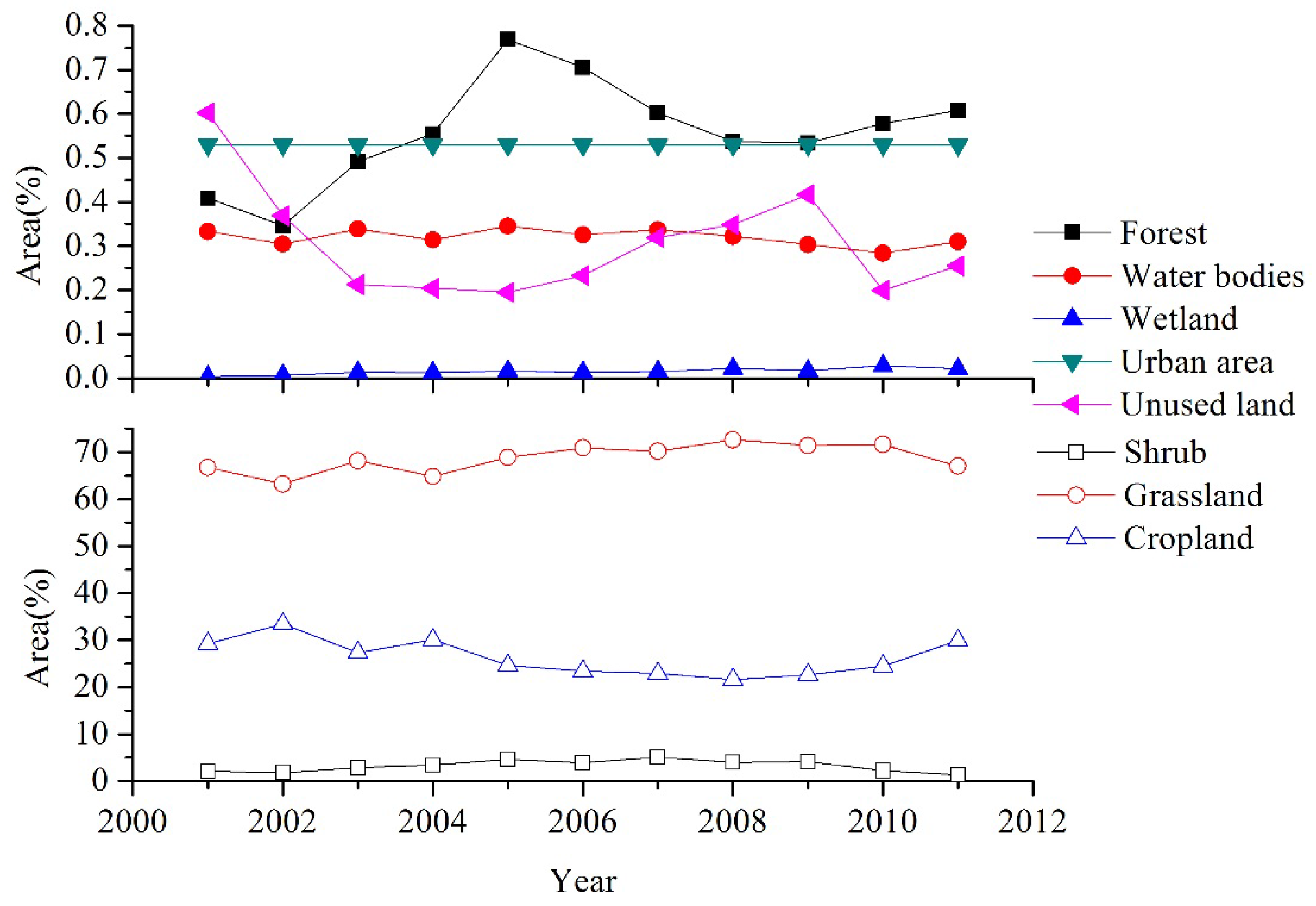 To address the potential response of RUE on land use, land use/cover changes (LUCC) were investigated in the west of Songliao Plain from 2001 to 2011. Figure 5 illustrates the changes in the proportion of eight land use/cover classes of the studied area. Grassland and cropland were the dominant land cover types, accounting for more than 60% and 30% of the entire region, respectively. It was found that grassland occupied 66.73% of the landscape in 2001 and rose to 67.01% in 2011. The portion of forest land increased slightly by 0.20% between 2001 and 2011, whereas the area of cropland decreased by 7.44% from 2004 to 2009. The cropland started to grow from the year of 2009 and its percentage reached 29.93% two years later. Wetland area increased slightly from 2004 to 2009, which might be associated with the construction of new wetland reserves. Shrub declined from 2.13% to 1.34% and the proportion of unused land dropped by 0.35% for the period of 2001–2011.