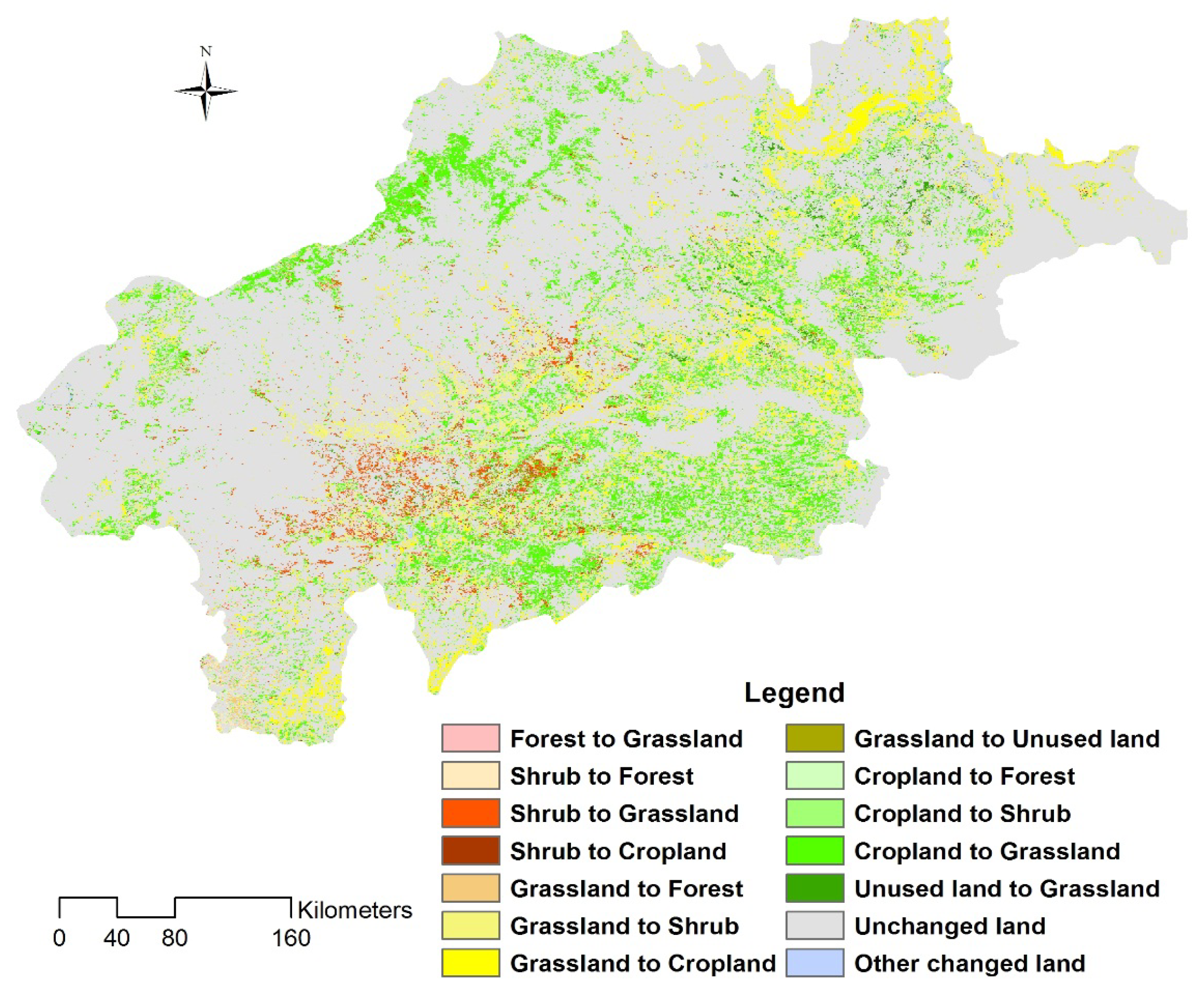 Figure 6 shows the spatial pattern of land use/cover change in the studied area. About 77.85% of the total land was unchanged. The loss of grassland was attributed to its transformation into cropland, which accounted for 6.29% of the landscape. As a result of the policies of the Chinese government concerning ecological protection, about 2.66 × 104 km2 of cropland or abandoned cropland returned to grassland, which accounted for 10.82% of the total land. The areas of conversions were 4012.25 km2 from grassland to shrub and 3903.75 km2 from shrub to grassland, while 1275.25 km2 of the unused land (barren and sparsely vegetated land) turned into grassland, which was contributed to national and local Returning Rangeland to Grassland programs.
