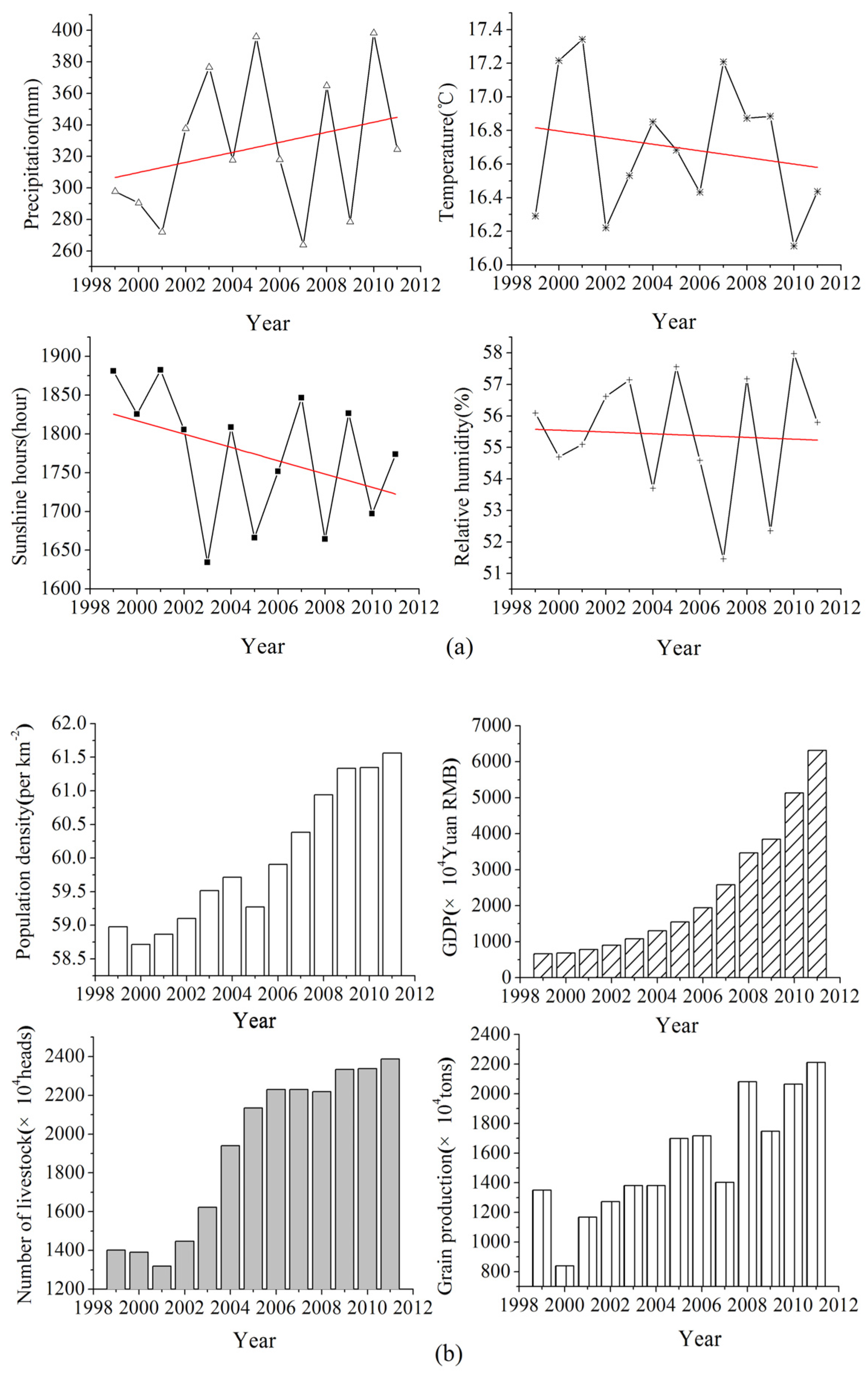 The socio-economic variables, including population, gross domestic product (GDP), grain yield and the number of livestock for 30 banners (counties or cities), were collected from local economic statistical datasets during 2000–2012 [43,44]. The annual statistical data of the counties or cities were firstly linked with the attribute table of the administrative map using JOIN function within ArcGIS. The vector maps were then converted to raster format using a grid-cell unit of 1 km2 by Vector to Raster tool of GIS. A total of 52 grid maps of four variables, i.e., population density, GDP, grain yield and the number of livestock were produced within ArcGIS and then used to perform a correlation analysis.