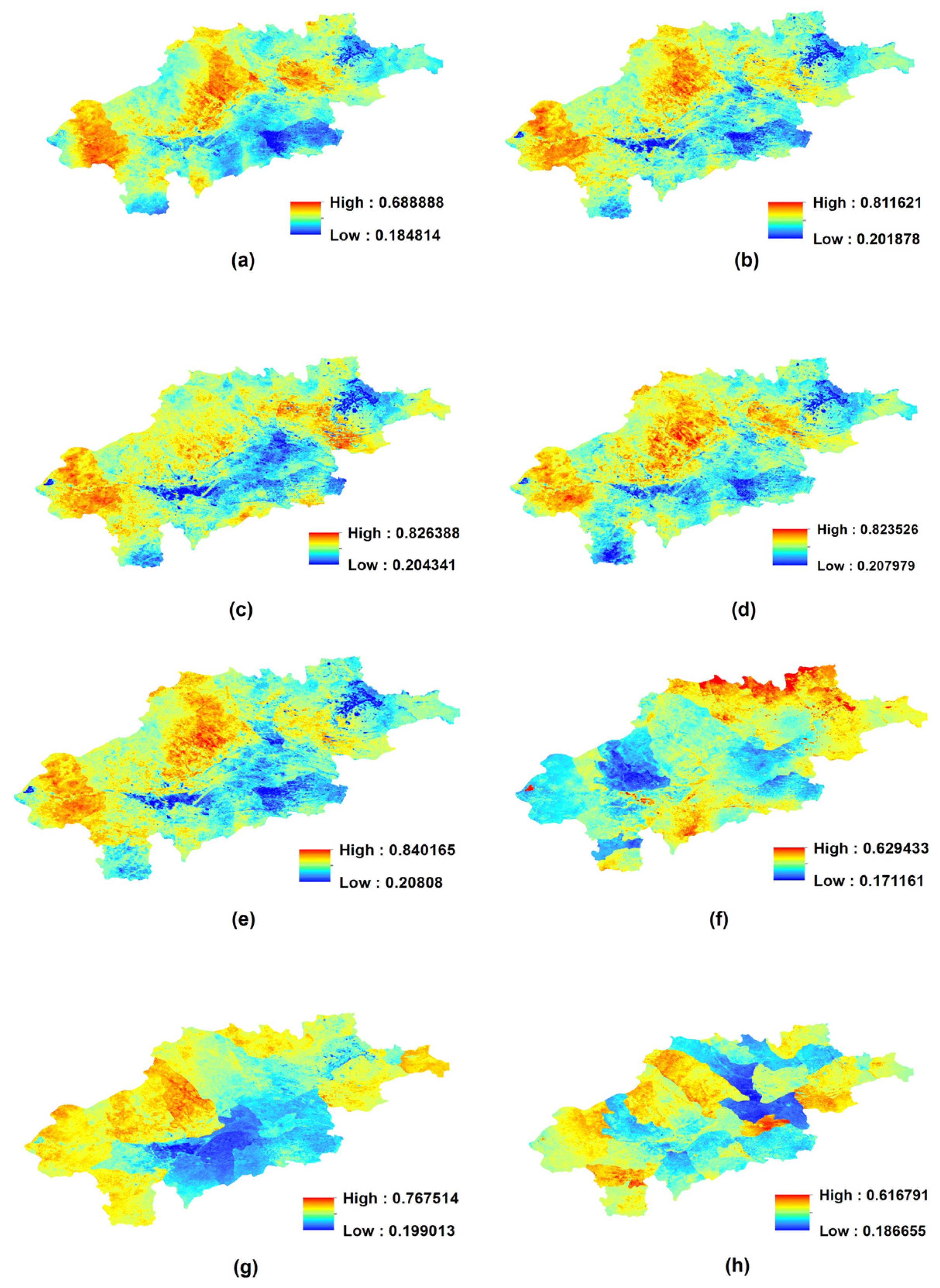 The original data series of the above eight impact factors were normalized by an averaging method in which all the values of each impact factor series were divided by the mean value of the series. The original series were converted to a set of comparable series. RUE for the studied period is the reference series X0 and the compared series of eight impact factors are represented by X1, X2, …, Xi, (i = 1–8). Then the grey relational coefficient ξxi(t) of compared series Xi(t) to reference series X0(t) at time t for each pixel was calculated using the following equation: