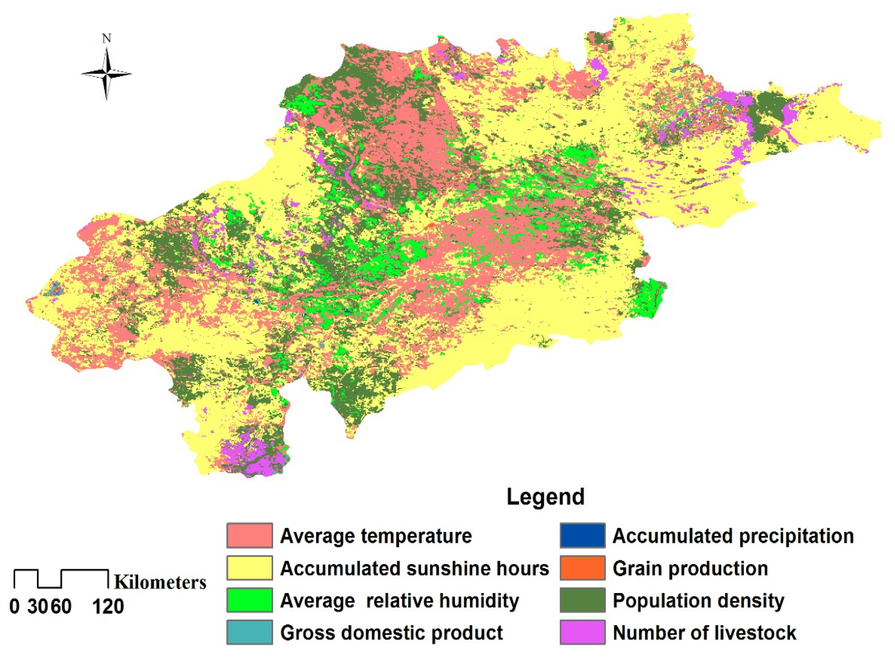 In accordance with the principle of grey relation analysis method, the higher grey relational grade (GRG) between the main sequence and the reference sequence, the more closely the sequences are related. Conversely, the lower GRG suggests less relation between the sequences. In this study, the higher GRG per grid value indicated the greater influence of a certain factor on RUE change. Firstly, the GRG values of each grid were sorted into descending order. Then the highest GRG value was retained for each grid and defined as the most influential determinant of RUE. The grid-based map of the most influential determinants was finally produced (Figure 10).