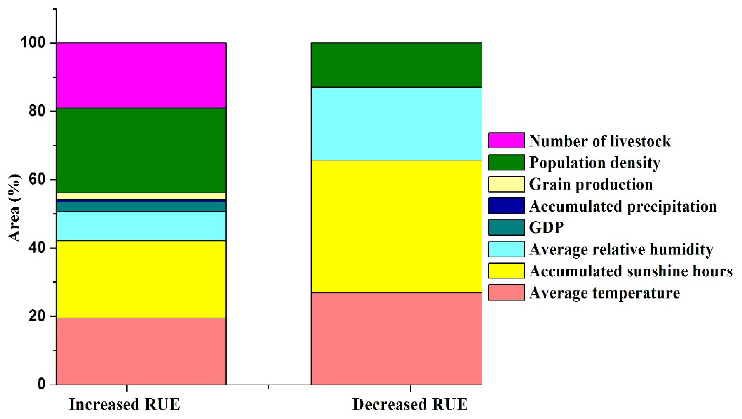 Figure 11 illustrates the area portions of the most influential determinant with significant increased or decreased trends in RUE at the 0.1 level. Significant decrease in RUE might be attributed to accumulated sunshine hours, average temperature and average relative humidity with the portions of 38.77%, 26.93% and 21.30%, respectively. By contrast, significant increase RUE was mostly related to first three factors including population density, accumulated sunshine hours and average temperature, accounting for 24.83%, 22.58% and 19.52%, respectively.