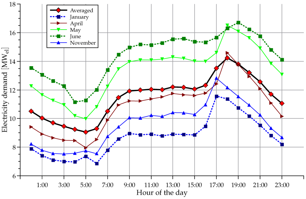 Figure 1 visualizes the electricity demand for each month during the year 2013 (for data completeness reasons, the data include March to December 2013 and January to February 2014. In the following analysis, the data is treated as from 2013). The total power consumption sums up to 100.7 with the lowest power demand of about 6.5 in the winter season (November to March) and the highest power demand of 10.5 during the summer season (May to August). The reason for these deviations can be mainly seen in the power demand of the air-conditioning systems of the hotels and private apartments. The assumption is proven by the strong correlation between the ambient temperature for the time period which is also visualized in Figure 1.