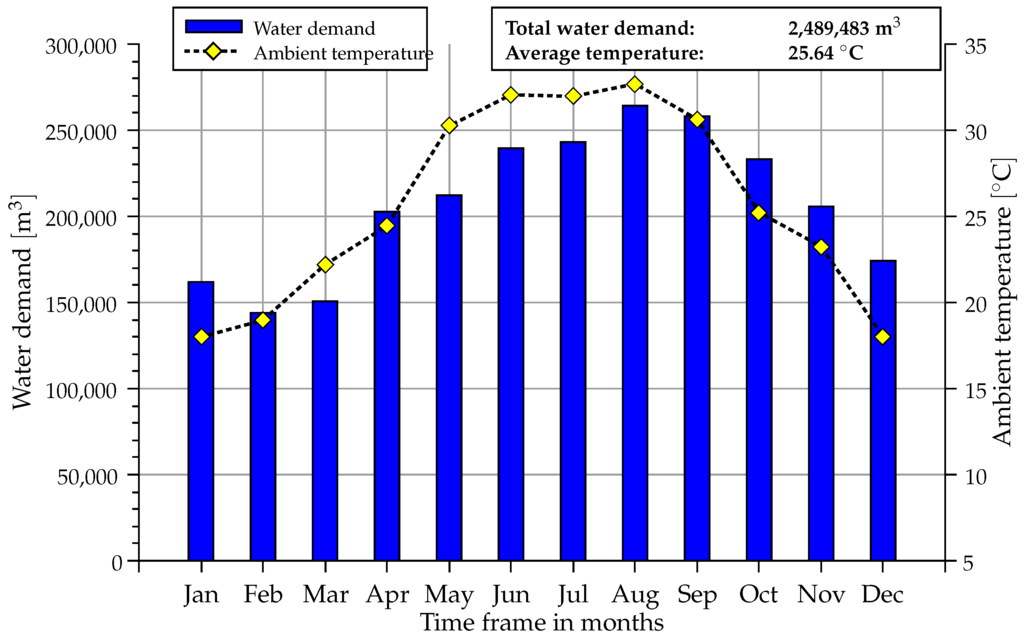 Water demand and ambient temperature in El Gouna [5,7,11].