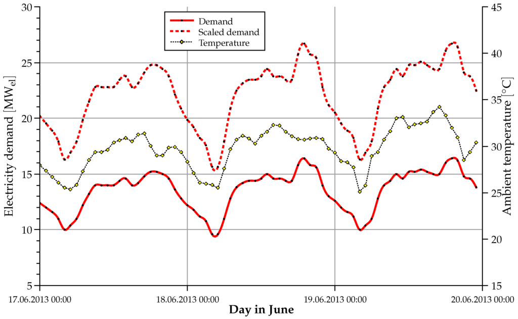 The average growth rate is estimated as 5% per year according to [13]. In order to estimate the future energy demand, is set to 10 years. Figure 4 maps exemplary the demand in ten years for three days of June basing on actual power demand at this day. The plotted ambient temperature shows the strong correlation between the electricity demand and the actual temperature of the particular hour of the day.