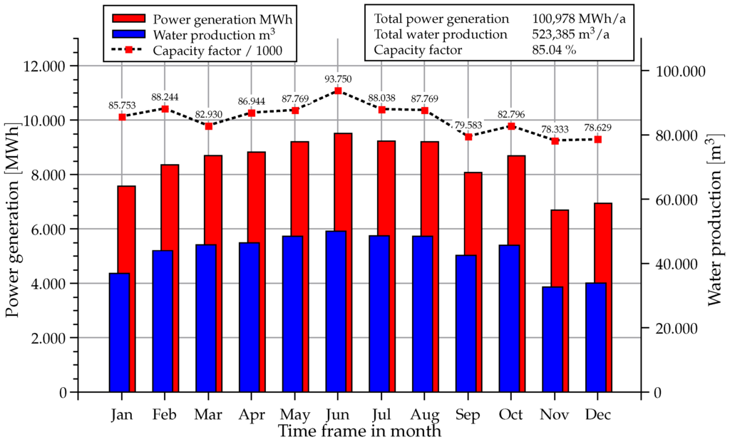 As the proposed plant also produces water, the levelized costs of water need to be introduced. The calculation can be compared to the LCOE calculation. In the literature it is also referred as levelized water cost LWC [31]. The calculation consists of the total lifetime cost of the desalination plant divided by the total gross water production in Equation (17). The parameters are identical compared to the given definitions except from the total water production .