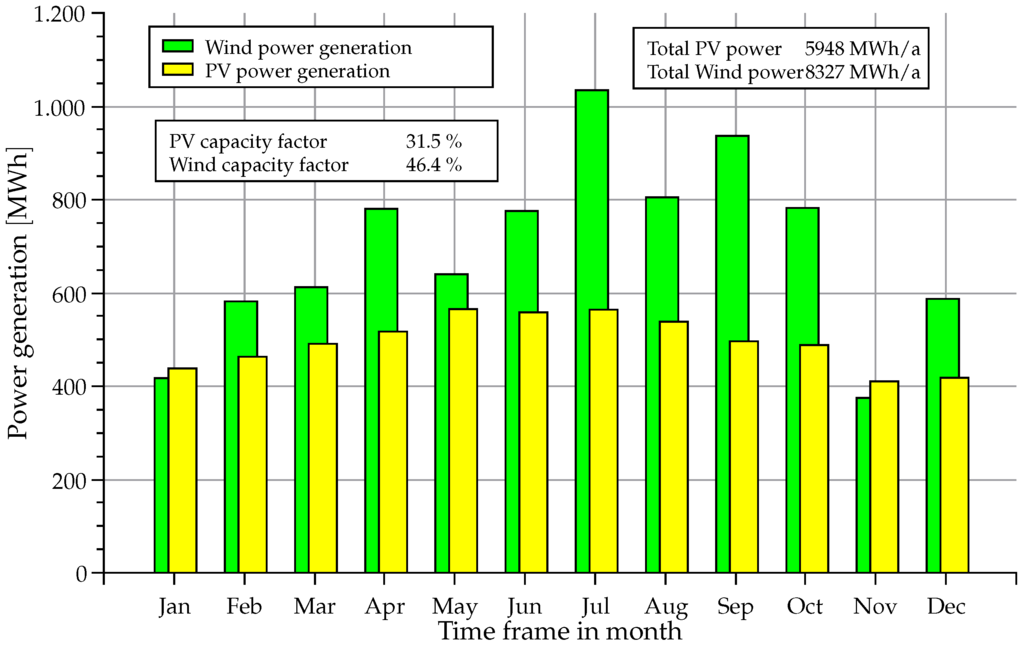 Basing on the monthly power generation of each technology and the weighed averaged mean share of the electricity supply, the derivation of a common value of the integrated system becomes possible. Table 12 summarizes the calculation for the discussed system configuration. Due to the technology characteristics and the complexity of the integrated system, a more detailed investigation and optimized plant sizing could be subject to further research.