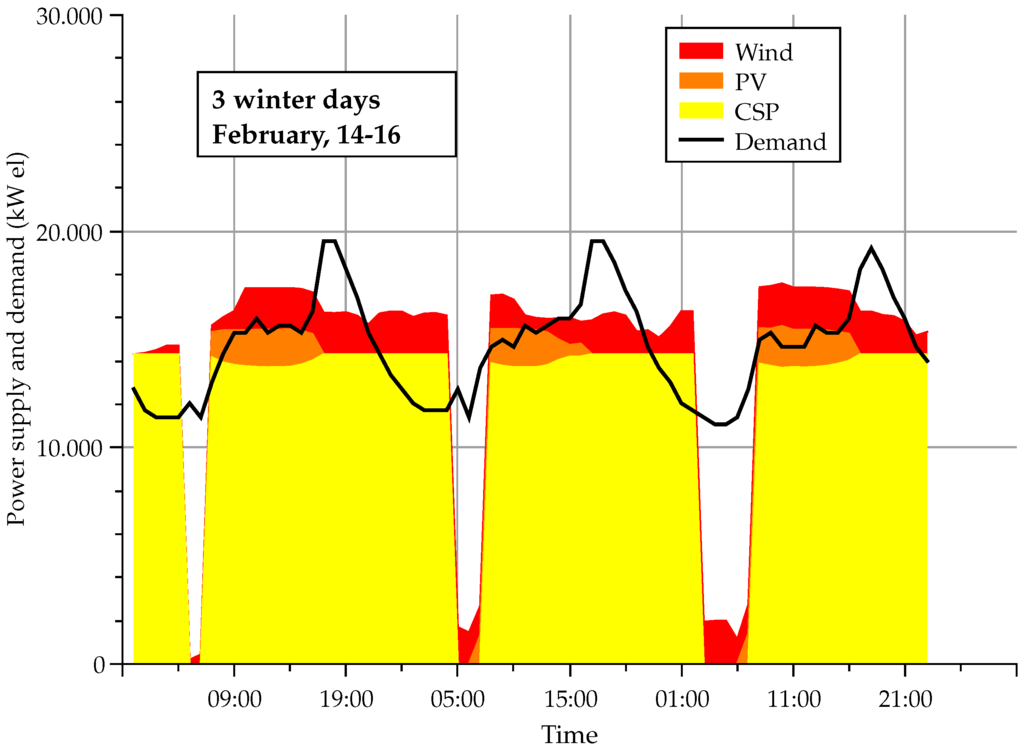 However, Figure 10 and Figure 11 allow a conclusion in terms of residual power demand which needs to be supplied from the national grid. The winter days in Figure 10 show an interrupted operation of the CSP plant during hours with low loads creating gaps of two or three hours down-time. During those hours, the wind power plant decreases the residual power demand depending on the actual wind condition. The strong ascending power demand during the morning hours is supported by the solar energy plants (both PV as well as the CSP). February, 15th, shows a lowered irradiation in the afternoon hours which lowers the PV plant power generation as well as the operation time of the CSP in the following night.