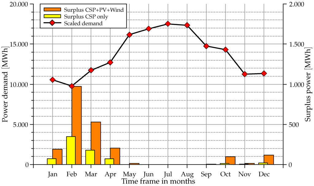 In the discussed configuration, only the CSP plant allows to deliver power on demand depending on the actual level of the thermal storage system. If the irradiation during the day cannot charge the storage sufficiently, the power generation is reduced because of the empty hot storage tank. The maximized operation of the CSP plant only creates a total cumulative surplus of 711 during the year.