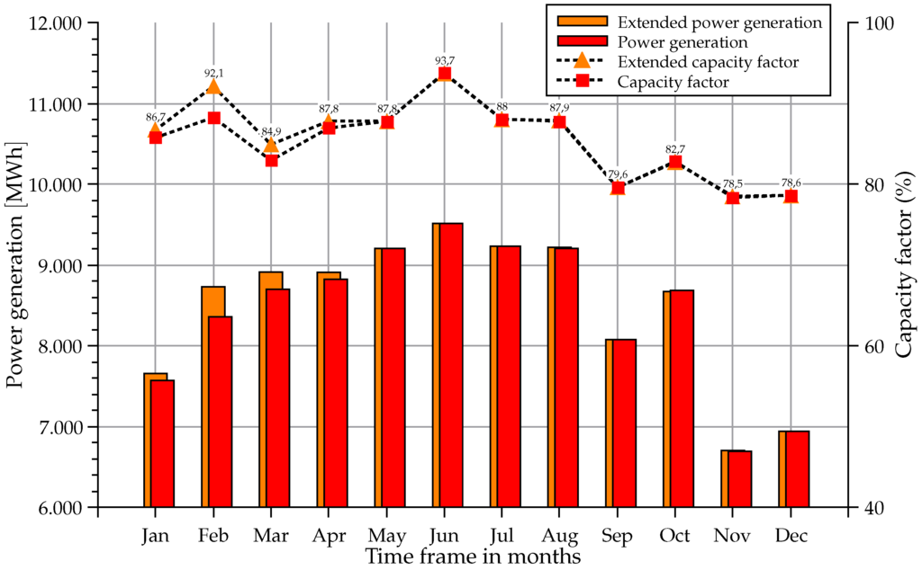 Figure 13 visualizes the increased operation time of the CSP by generated surplus power from the PV and wind power plant. It can be stated that only during the winter is a noticeable extension of the CSP operation time. The CSP power generation is increased by up to 4.5% in February, the other months show a negligible extension of the operation time in the range of 1%–2%. The calculation of the complete year results in a generated power extension of 0.8%.