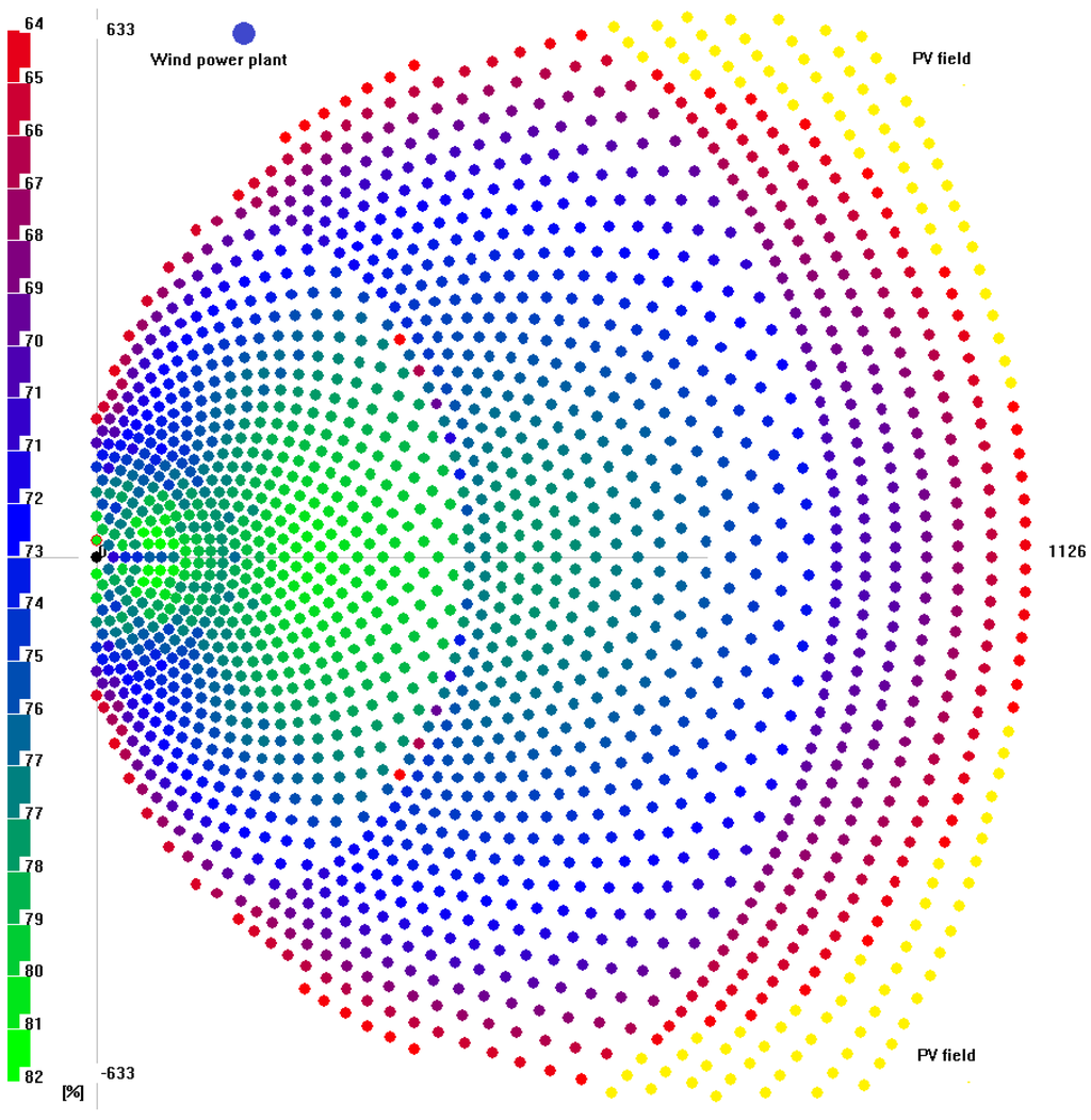 Due to the arrangement of the heliostats around the tower (Figure 14), the occupied land principally has a round shape. Based on the assumptions (Section 3.3), the integrated power supply system is integrated in the given layout of the field. The assembly of PV modules on given heliostats replacing the mirrors lead to cost advantages through economies of scale. In addition, the PV modules generate more electricity by orientating them continually in an optimal angle to the solar irradiation.