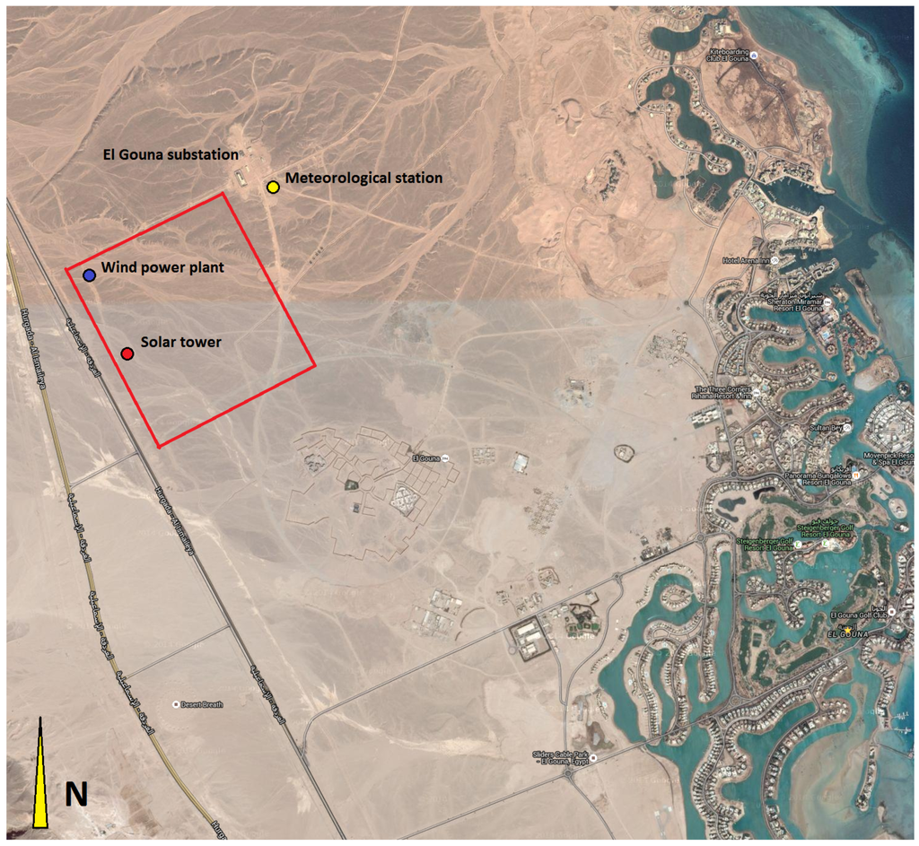 The required land is marked in Figure 15. The locations is chosen close to the road Hurghada—Cairo in order to allow a possible expansion of the city on undeveloped land. The presence of an own substation connected to the national grid as well as a waste-water treatment plant simplifies the media connection for electricity and water.