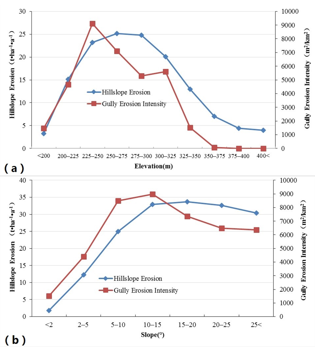 The differentiation of hillslope and gully erosion on various elevations is demonstrated in Figure 7a. In the vertical direction, the hillslope and gully erosion showed a layered distribution, increasing first and then decreasing as the altitude increases. This result indicates that the geomorphic types of lower elevations (e.g., valley plain) were dominated by modern deposition. No significant erosion occurs at higher elevations (e.g., hill) due to the small catchment area, while slope land between the abovementioned regions was the main level of the occurrence and distribution of soil erosion [66]. Moreover, the magnitude of gully erosion intensity (at 225–250 m) was lower than that of hillslope erosion intensity (at 250–275 m). We assume that, compared to slope erosion, gully erosion is not only affected by the slope but also by the catchment area and other topographic factors. The lower slope land is more conducive to the formation and development of gully erosion due to a longer slope and larger catchment area [10,56].