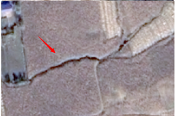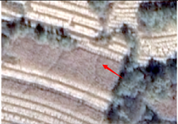 where P is the value of the Water Conservation Measures factor and α is the angle between ridge direction and slope aspect in degrees (0°–90°). Ph is 0.352 when the angle is 90° [9], i.e., Contour Ridge, which means that the ridge direction is parallel to the contour line and perpendicular to the slope aspect. Ps is 1 when the angle is 0°, i.e., Downslope Ridge, which means that the ridge direction is perpendicular to the contour line and parallel to the slope aspect. The specific steps are as follows: (1) according to the visual interpretation of the Pleiades image, this paper segmented the farmland into plots with the same ridge and assigned the ridge direction azimuth to each plot by outlining the ridge direction line (Figure 3); (2) DEM was used to generate the slope aspect layer; (3) the ArcGIS grid calculator was applied to calculate the angle between the ridge and slope direction. p-values of arable land on the flat ground and other LULC types were assigned as 1, usually without any soil and water conservation measures.