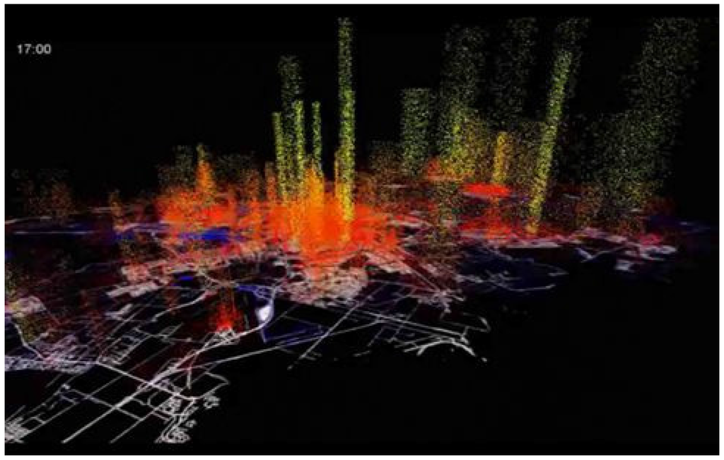 In the present days new instruments need to be explored in order to be able to assess the two main changing realities that characterize the post-industrial world, which according to Shane are the technological and the ecological ones [15]. Grimm et al. stress the need to incorporate geological, ecological, climatic, social, and political data to describe and understand urban functioning [16]. Girot refers to the invisible “natural substrate of the sites” and, more specifically, mentions the natural water flows (covered or diverted), the erased topographies, or the fragmentation of forests [10]. Cities have started to be considered as dynamic, living organisms. Ridd and Hipple refer to cities as ecosystems and, as such, they identify the energy and moisture fluxes as the main drivers of their activity [17]. They use remote sensing to investigate parameters such as anthropogenic energy or the percentage of imperviousness of surfaces, parameters that affect these two balances. Aligned with this dynamic concept of cities, Acebillo refers to the urban metabolism and studies parameters such as energy consumption, waste emissions, or mobility matrixes [18]. Chao et al. [19] have produced a review of the evolution of the urban climatic maps which propose urban planning guidelines based on parameters that range from thermal imagery to topographic maps, land use maps, urban air paths, emission maps, etc. By means of energy potential mapping, or heat mapping, Broersma tracks city’s heat characteristics; these can be represented by layered maps or three-dimensional images [20]. Their heat map of Rotterdam maps the heat demand and yield potential. Van der Hoeven and Wandl mapped air and land surface temperatures, the components of the surface energy balance, as well as social and physical factors that contribute to the vulnerability of the urban population for urban heat [21]. Other urban planners have started to study a wide range of statistics concentrating in the behavior of citizens, crime rates, surveillance, traffic, light-switch activity [22] (Figure 1), or even cell phone activity [23] (Figure 2).