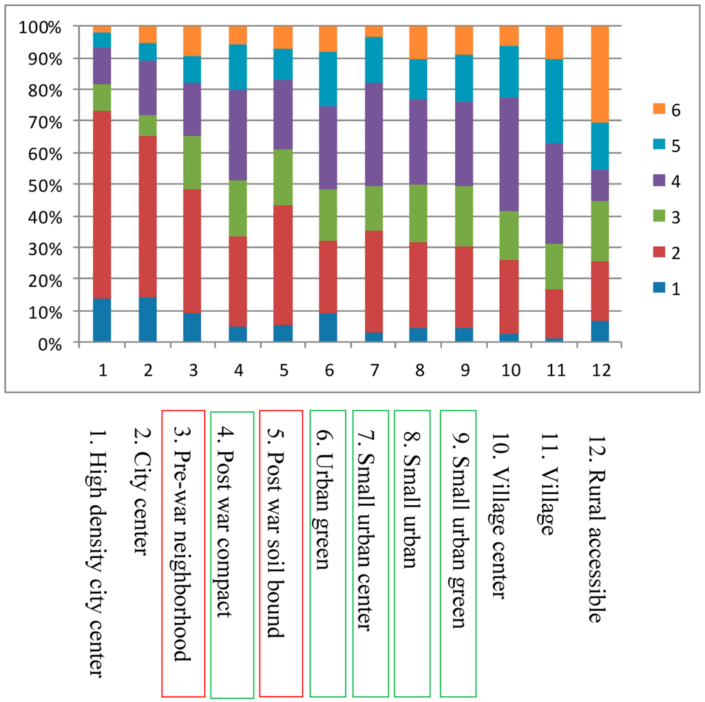 Surface cover cluster proportions for each of the “urban living environment” categories in the analyzed medium-size cities of the North Brabant region [56]. Neighborhoods 3 and 5 present similar cluster proportions, and thus could be grouped. Neighborhoods 4, 6, 7, 8, and 9 present similar cluster proportions and, thus, could be grouped.