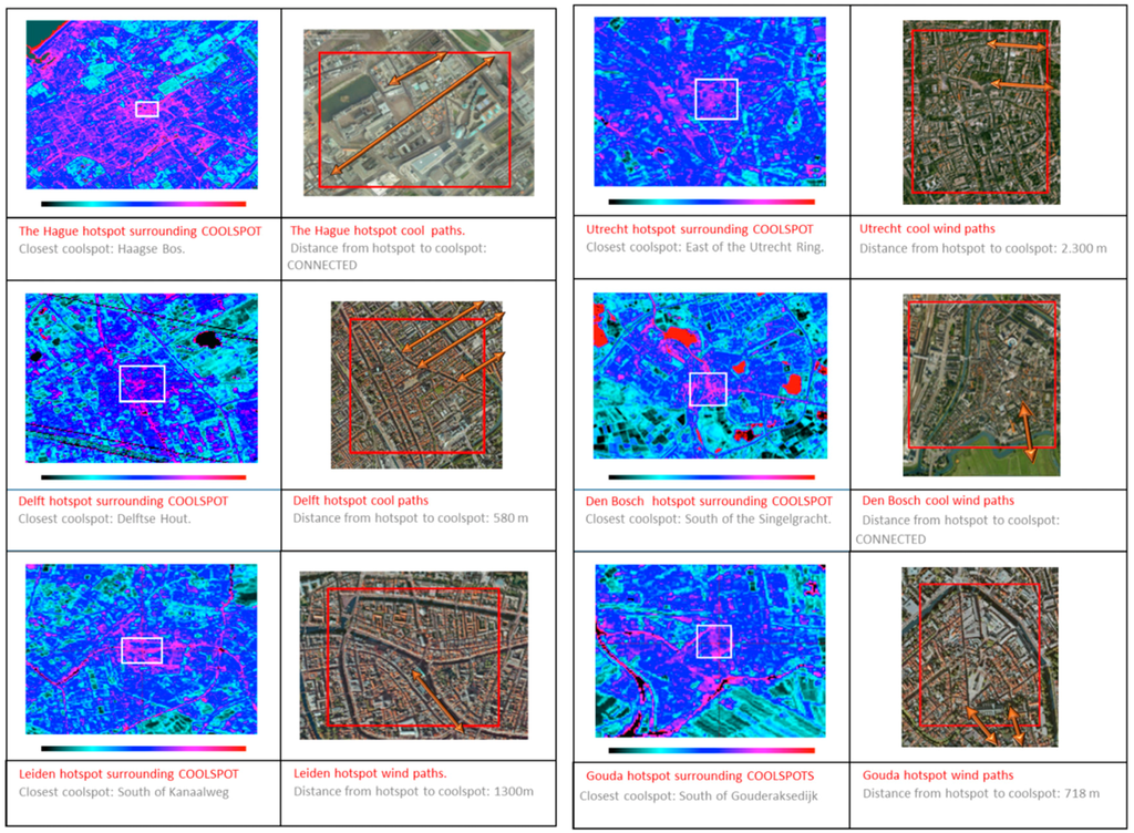 Comparative hotspot, coolspot, and wind corridor analysis for the Dutch cities of The Hague, Delft, Leiden, Utrecht, Den Bosch, and Gouda [57].