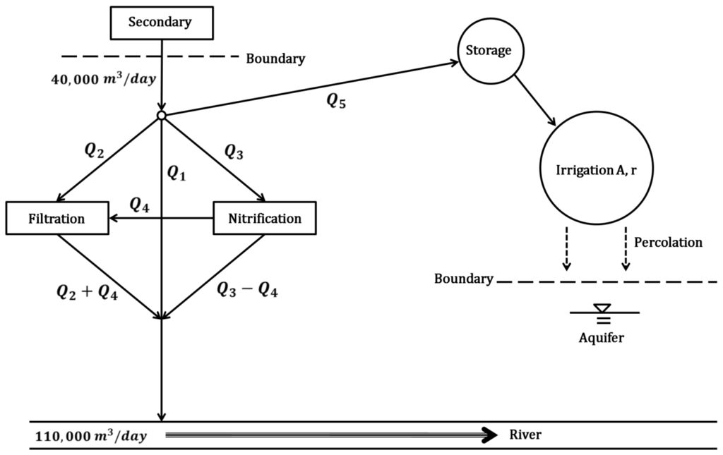 The expanded wastewater treatment system consists of two additional treatment systems (filtration and nitrification) and one diverted irrigation system as shown in Figure 1. In the system, we have to decide five decision variables, including (1) wastewater amount discharged directly into the river ( 103 m3/day); (2) wastewater amount treated by filtration operations ( 103 m3/day); (3) wastewater amount treated by nitrification operations ( 103 m3/day); (4) wastewater amount treated by both nitrification and filtration operations ( 103 m3/day); and (5) wastewater amount diverted for irrigation and fertilization ( 103 m3/day). Table 1 shows the effluent quality after each treatment.