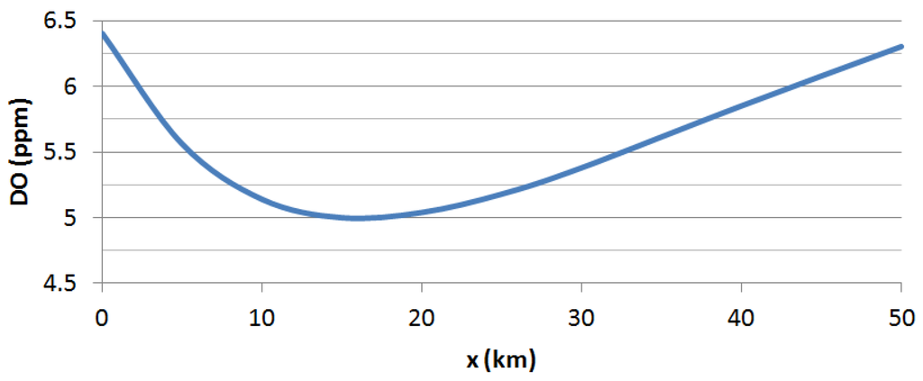 For the discharged amount () into the river, dissolved oxygen at a distance ( km) from the point of wastewater discharge can be expressed as the following differential equation: