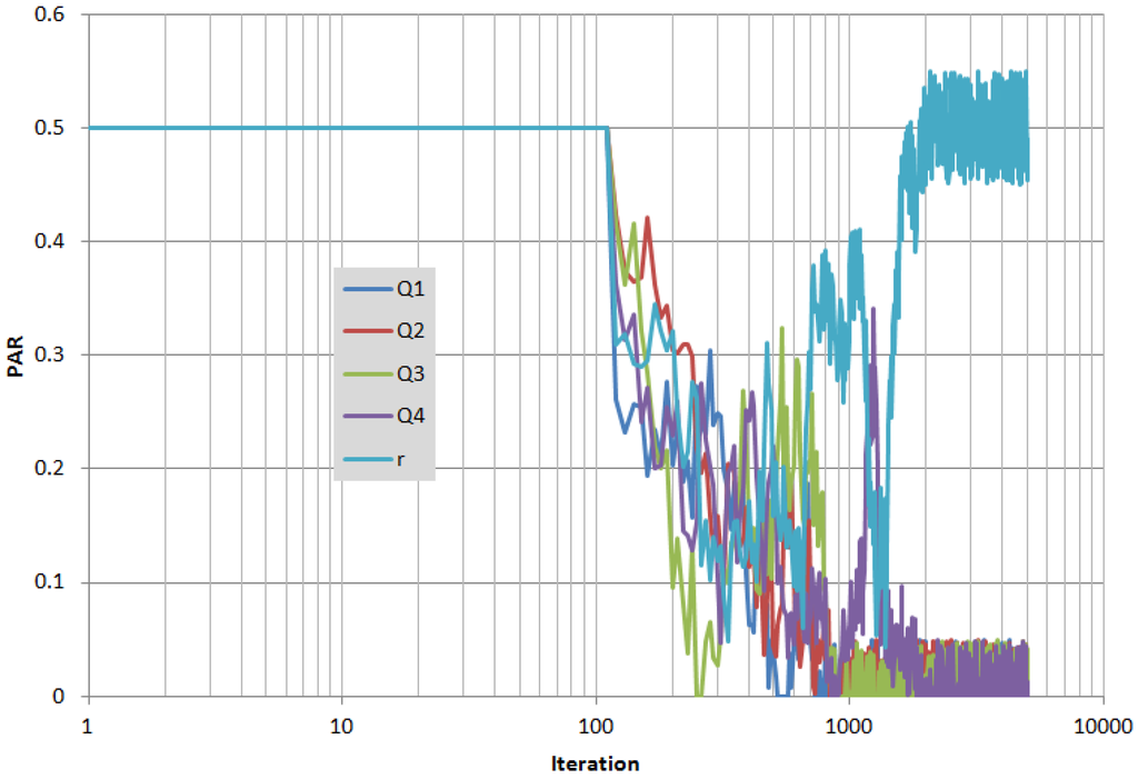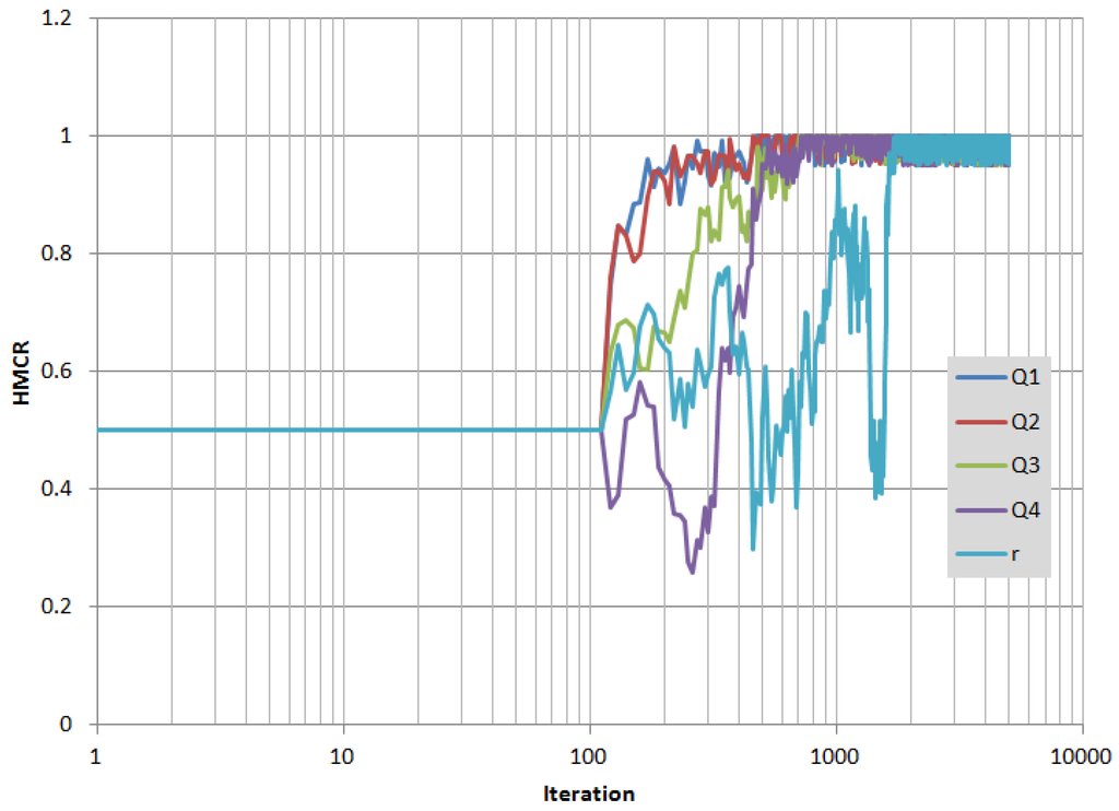Figure 3 and Figure 4 show the trends of HMCR and PAR, which have been automatically adapted, as the iteration goes.