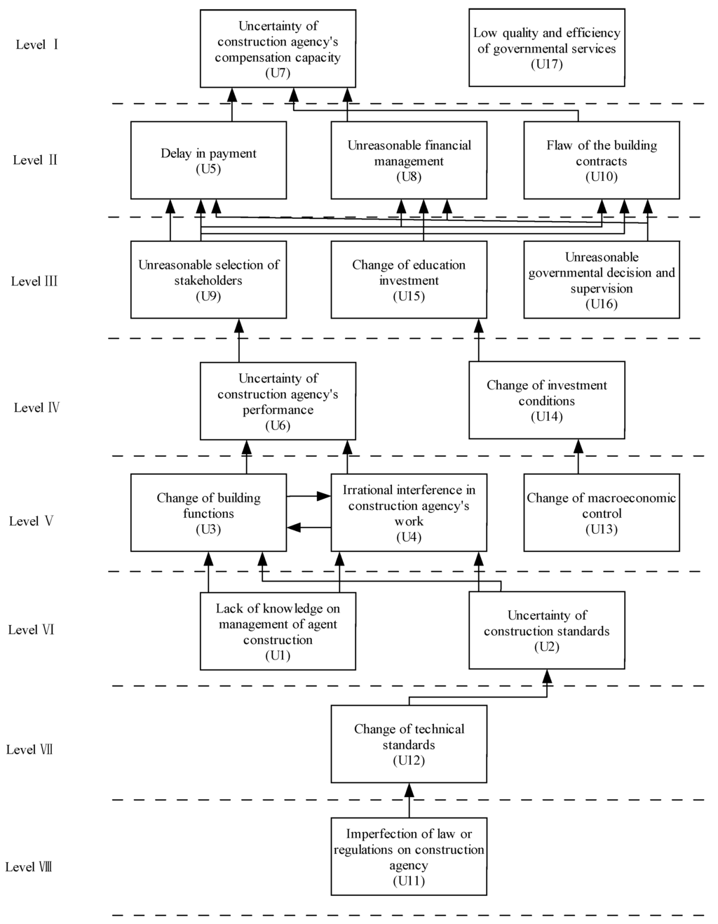The hierarchical structure model was established on the basis of the identified level in Table 6 and determined relationship in Table 4. For example, for factor U1 (lack of knowledge on management of agent construction) at level VI, the entries corresponding to factors U3 and U4 at level V are 1 and the entry corresponding to U13 is 0. This finding implies that U1 leads to U3 and U4, and that no relationship exists between U1 and U13. Therefore, an arrow with the head pointing to U3 and U4 is used to link U1, U3, and U4. Following the same manner, the interrelationship of risk factors can be graphically illustrated in the structural model as shown in Figure 2.