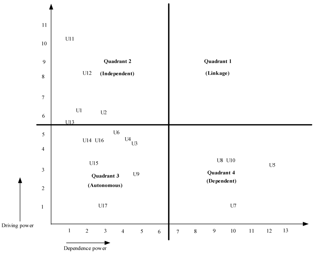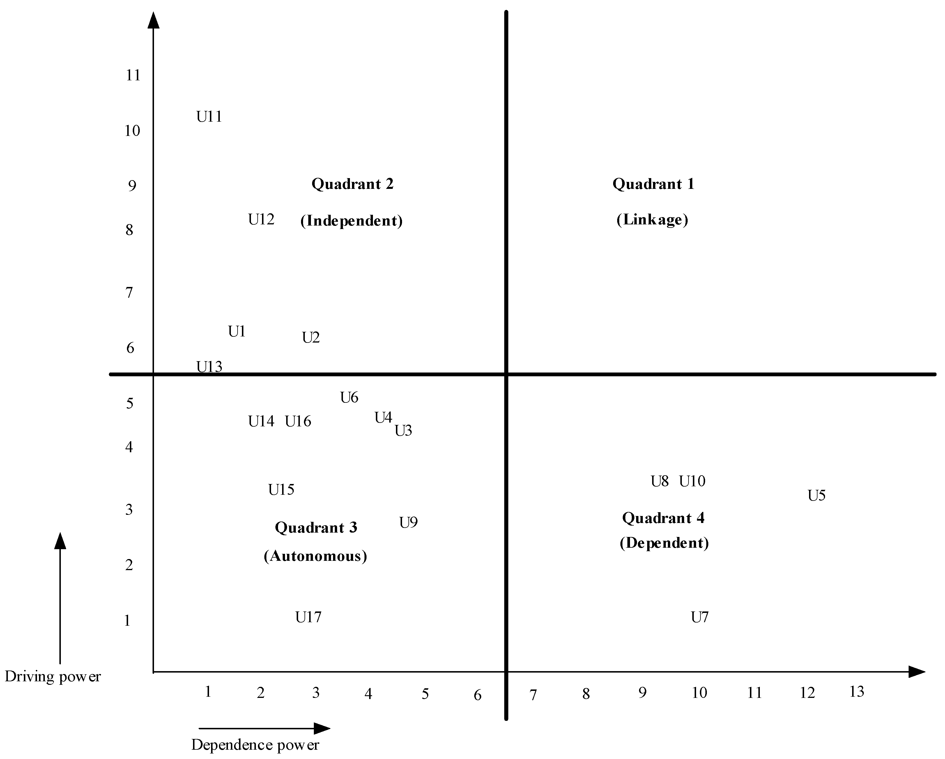 Based on the results of fuzzy MICMAC analysis, a coordinate system can be developed to group the risk factors for better understanding. According to the results in Table 8, the half range for the driving power is 5.5, while for the dependence power it is 6.5. Four Quadrants can therefore be divided according to the half ranges as shown in Figure 3. Quadrant 1 is named as “linkage”, where the factors have comparatively high driving power and high dependence power. These factors play a bond function among the risk factors. However, in this study, there is no “linkage” risk factors. Quadrant 2 is nominated as “independent”, where the factors have comparatively high driving power but low dependence power. These factors somewhat affect most other factors, but are impacted by few other factors. By referring to the structural model, it can be found that these factors mostly lie in the lower bottom level. In this study, there are five factors in Quadrant 2. Quadrant 3 is called “autonomous”, in which the factors have comparatively low driving power and low dependence power. These factors affect few other factors and also are affected by few other factors. By referring to the structural model, it can be found that these factors mostly lie in the middle level. In this study, there are eight factors in Quadrant 3. Quadrant 4 is called “dependent”, in which the factors have comparatively low driving power but high dependence power. These factors affect few other factors but are affected by most other factors. By referring to the structural model, it can be found that these factors mostly lie in the upper top level. In this study, there are four factors in Quadrant 4.