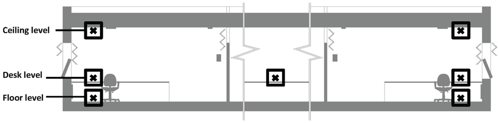 Section 4. Environmental measurements were applied to measure the particular thermal environment at the surveyed workstations and to evaluate the overall building performance: instant and constant measurements, respectively. The instant measurement was applied on the desk level at the surveyed workstations. For the constant measurement, particular measuring points were selected in particular locations in the building on the floor, desk, and ceiling levels, as demonstrated in