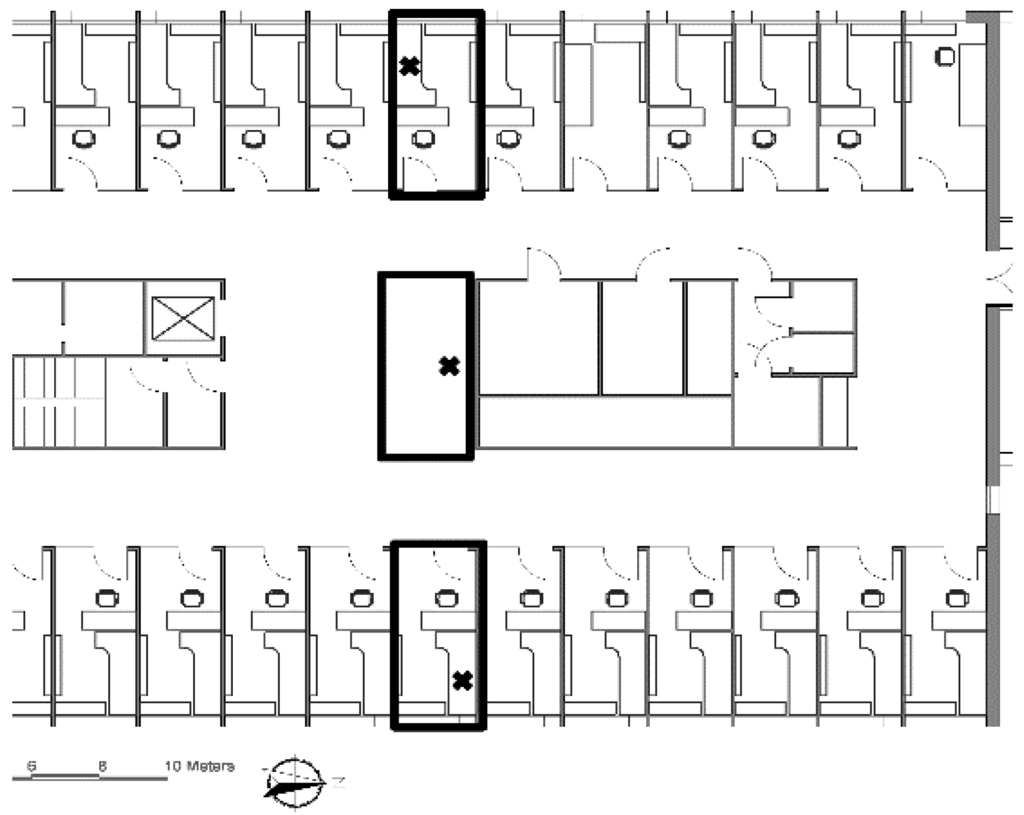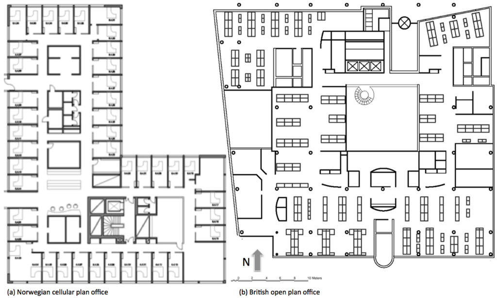In this section, ventilation performance, thermal performance, light, and carbon dioxide levels are analyzed and compared to the standards. In the Norwegian offices, every occupant was provided with a personal office, which was located around the perimeter of the building in order to access a window with an outside view, natural light, and ventilation. Services, such as toilets, pantries, meeting rooms, and social spaces, were located in the center and a corridor connected them to the personal offices. Each office had a glass wall or door in order to improve the visual connection to the rest of the office, as presented in