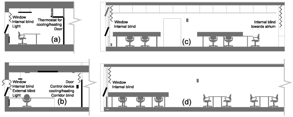 35]. Every occupant was provided with an openable window, a door, thermostat, and blinds in the personal office. In contrast, the U.K. practices provided thermal control only for those occupants seated around the perimeter of the open plan offices. The majority of the occupants seated away from the windows had no access to any means of control over the thermal environment, as illustrated in