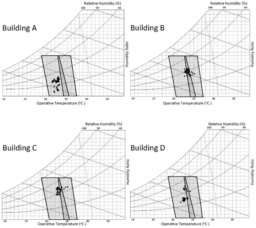 This analysis showed similar and acceptable conditions in all four buildings with “neutral” or “cool” conditions. Building A was expected to be slightly cooler than the other buildings, as presented in