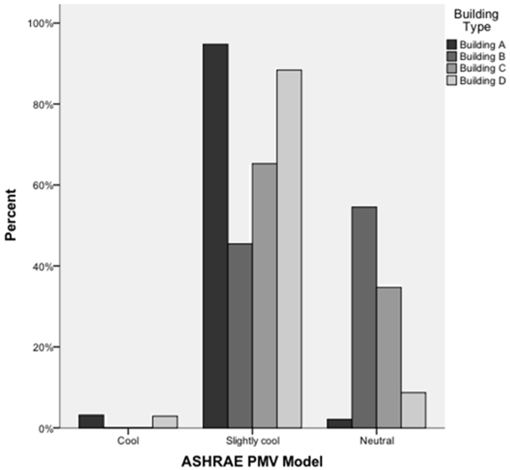 The Predicted Mean Vote (PMV) analysis was applied to evaluate the thermal performance of the buildings in accordance with the ASHRAE Standard 55-2013 [