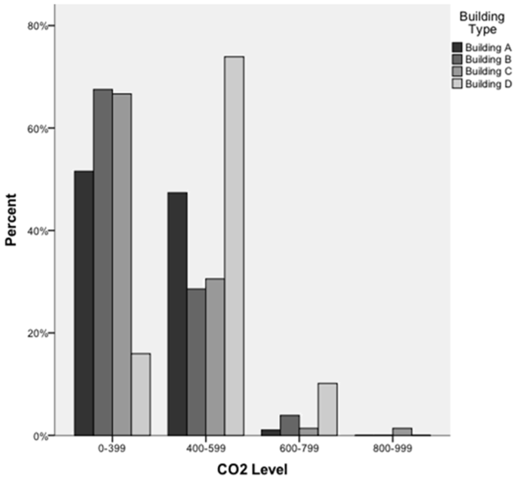 Figure 9. Only in Building C, which is a naturally ventilated building, did the concentration of carbon dioxide exceed 800 ppm. According to Tietjen