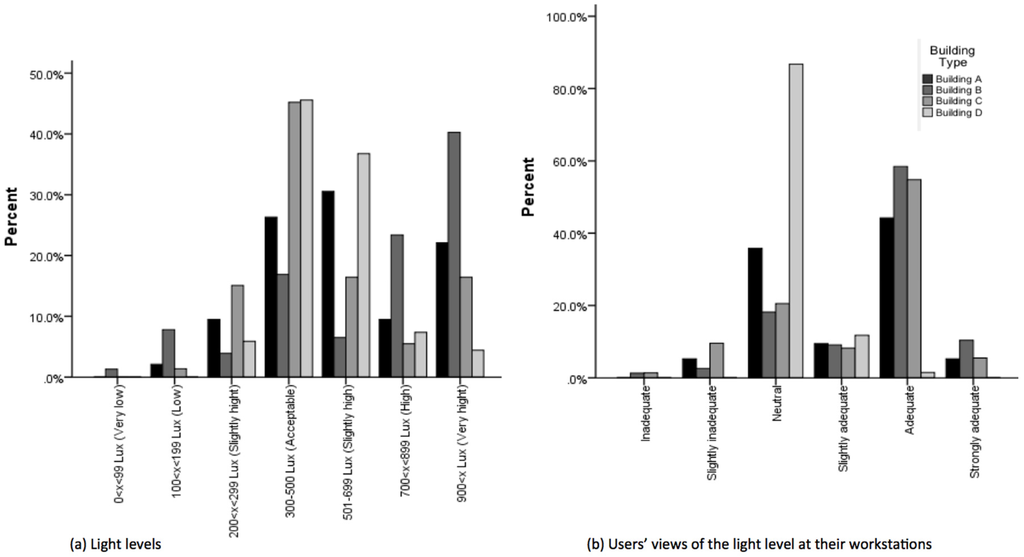 Figure 10b, the survey questionnaire showed high levels of user satisfaction with the light level in the cellular offices compared to the open plan offices, particularly building D, which was a deep open plan office with mainly artificial lighting and no light switches. Further analysis of lighting and building-related symptoms is presented in analysis section.