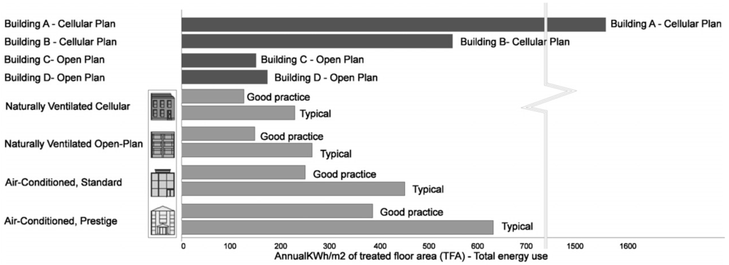 2 per year). This was mainly due to the application of contradictory thermal systems to provide occupants with thermal control and comfort, as explained earlier. Building C was the most energy-efficient case study, due to the natural ventilation. Overall, the British open plan offices are much more energy efficient (150 and 160 Kwh/m