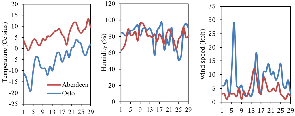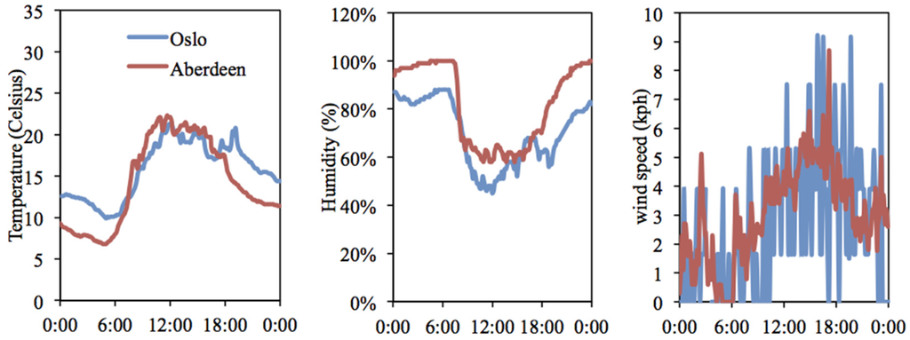 2. Accordingly, the energy consumption of each British occupant was 47.32 KWh and that of each Norwegian occupant was 590.17 KWh. As mentioned above, in summer the weather conditions of the south of Norway and the north of Scotland were relatively similar, as illustrated in