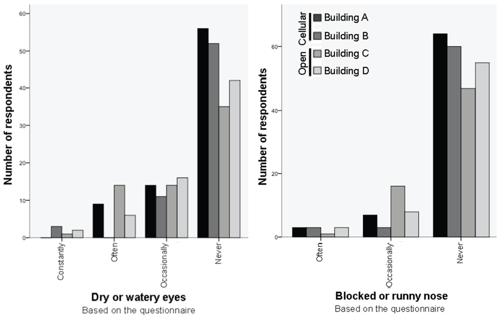 Figure 14. The majority of the occupants in the cellular offices never suffered from dry or watery eyes. The numbers are lower in the open plan offices. Some occupants suffered constantly from eye symptoms in three of the buildings, while no one reported suffering constantly from nose symptoms. Some occupants in Building B, which was an air-conditioned cellular plan office, reported suffering constantly from eye symptoms. One of the respondents identified the malfunctioning air conditioning in her room as the cause of her symptoms. This is further explained in the interview section. Although more occupants in the cellular offices never suffered from a blocked or runny nose compared to those in the open plan offices, the difference was not as conspicuous. The frequency of nose symptoms was lower than eye symptoms in all four buildings.