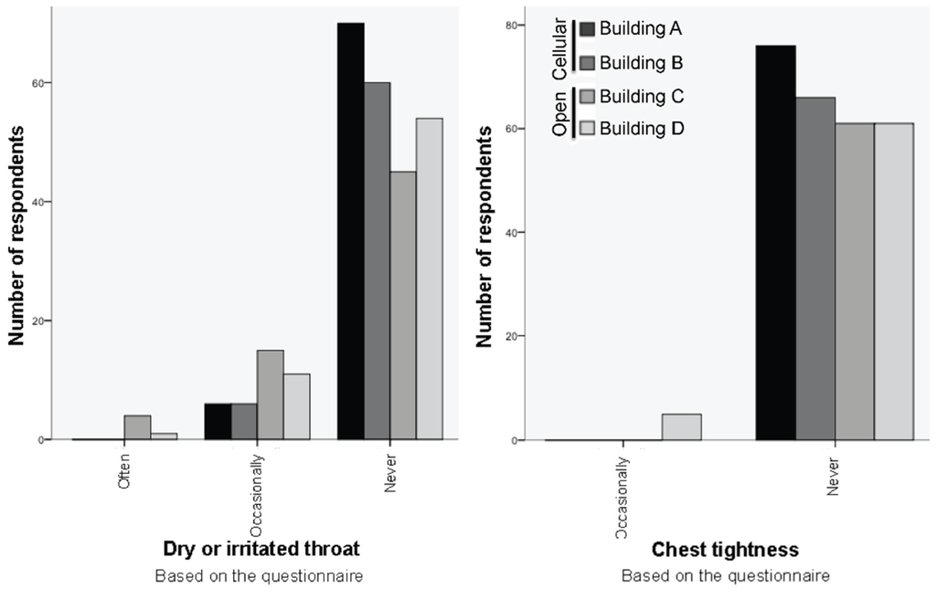 Figure 6. More occupants suffered from a dry or irritated throat in the open plan compared to the cellular plan offices. The majority of the occupants of the cellular offices never suffered from this symptom and no one reported that they suffered often or constantly. In contrast, fewer respondents reported never suffering from throat symptoms in the open plan offices and some participants often suffered. Chest tightness was the least reported symptom and only a few respondents in the displacement-ventilated open plan office reported that they occasionally suffered from chest tightness.