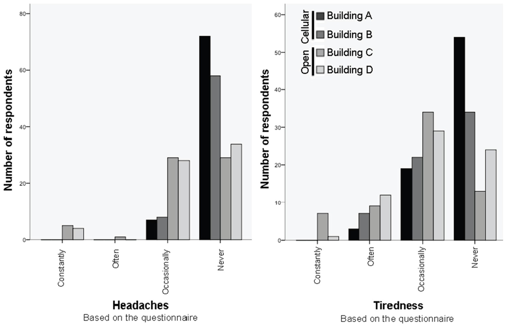 No participants (0%) in the two cellular plan offices reported constantly suffering from tiredness, while 6% of the respondents in the open plan offices reported experiencing constant headaches.