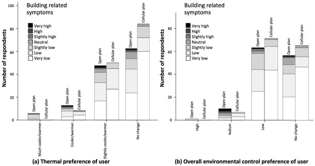 Figure 17. Respondents with a low desire to change the temperature or to apply environmental control had low or very low symptoms. The higher respondents’ desire to apply control, the more likely they suffered from building-related symptoms. Further regression analysis showed a significant relationship between building-related symptoms and variables including the thermal preference of the respondents (