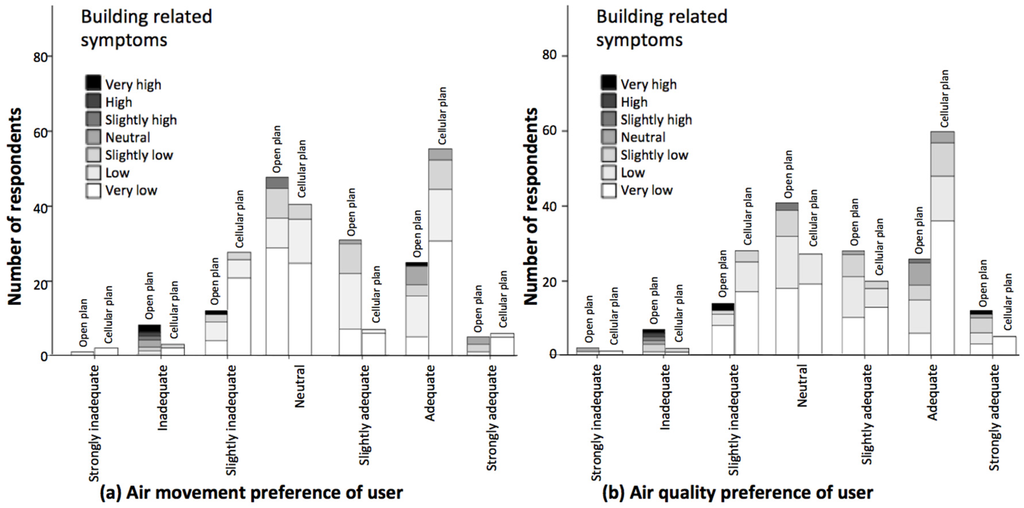 Figure 18. Respondents who reported the air movement and quality as inadequate or strongly inadequate suffered more from the symptoms, particularly in the open plan offices. However, further regression analysis showed no significant relationship between building-related symptoms and respondents’ desire to change the air movement (
