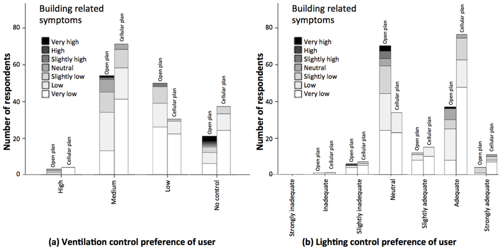 36]. The analysis indicated a significant relationship between building-related symptoms and the planning of the office environment. It demonstrated that the two open plan offices with limited levels of thermal control had a higher risk of Sick Building Syndrome in comparison to the two cellular plan offices, which, while mechanically ventilated, featured a comprehensive provision of thermal control. These findings concur with other research in the field indicating that health and control are related and a lack of environmental control causes health-related issues [