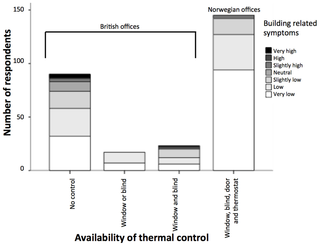 i.e., constantly or often) symptoms and no respondent in the Norwegian model reported suffering greatly or very greatly from symptoms. Further regression analysis showed a significant relationship between building-related symptoms and the availability of thermal control (