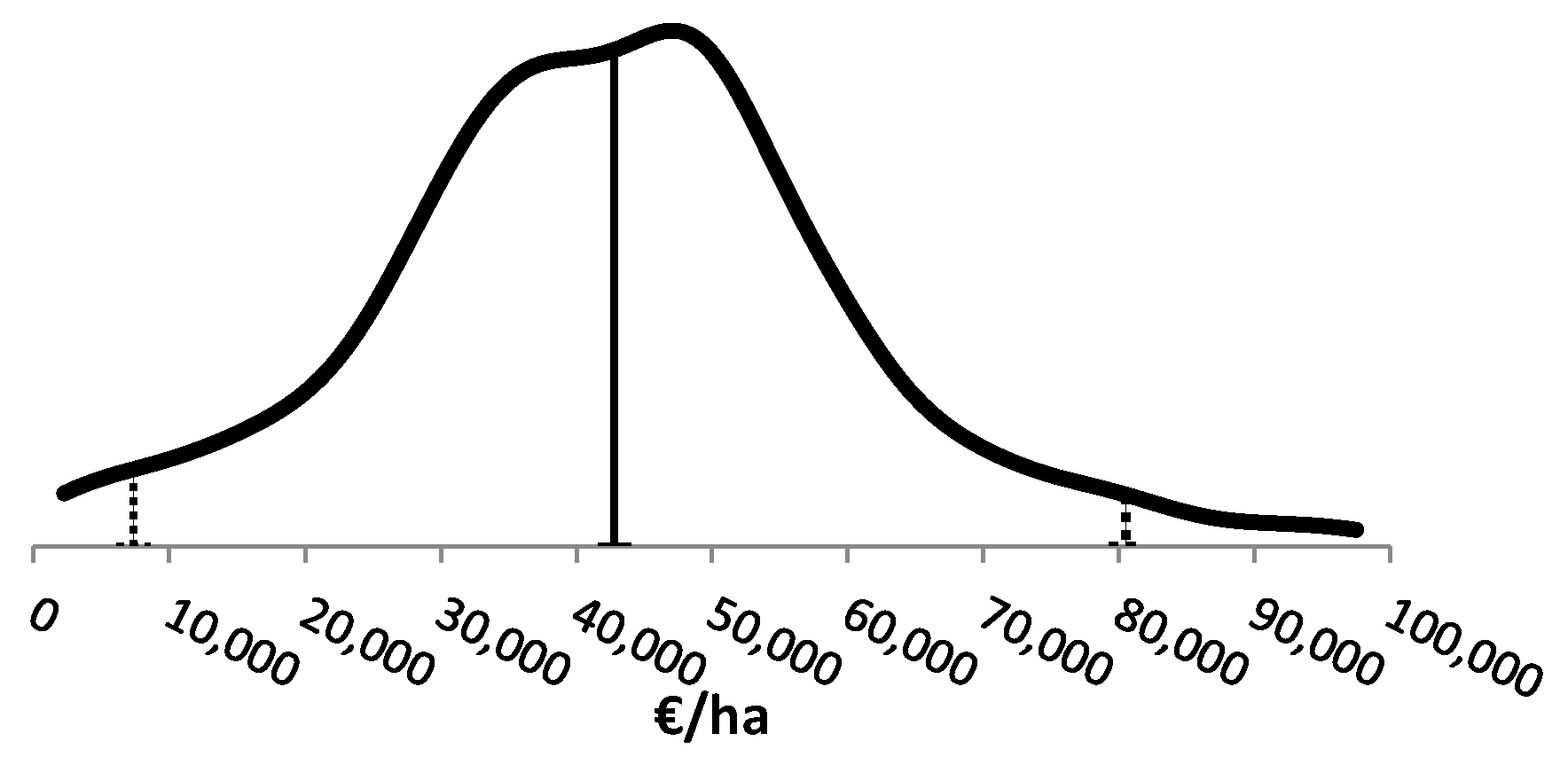 Given the above stochastic variables, revenues per ha are estimated stochastically and are illustrated in Figure 2, while Table 2 presents their expected values. According to Figure 2, in 95% of cases, revenues fluctuate from 8,000 €/ha to 80,000 €/ha, whereas the mode value is approximately 50,000 €/ha.