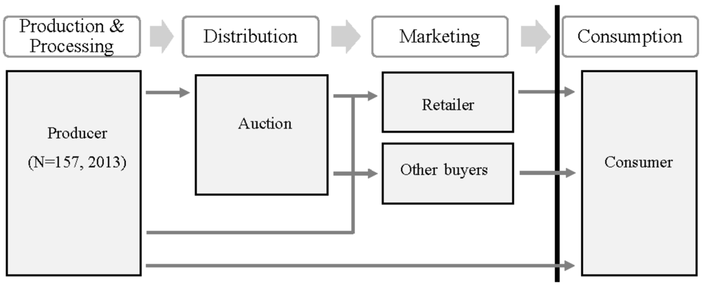 A universally accepted definition of local food does not yet exist. Often, the local-global dichotomy is based on the geographical distance between producer and consumer and the supply chain configuration, such as the number of supply chain steps and the kind of marketing channel, e.g., [4,50,51]. However, the maximum distance at which a product changes from being “local” to being “global” is not clearly defined. In some studies, local food refers to food that has been grown within a country’s boundaries and global food refers to imported products [6,52]. In other cases, “local” food is defined as food that is grown and consumed within a county [8], or that is marketed through a short supply chain, such as a farm shop, a farmers’ market or a CSA (community-supported agriculture) system [4,53]. International sourcing of production inputs for locally produced and consumed products complicates the distinction of “local versus global” [1]. In this article we follow the definition based on national boundaries and distinguish between a local chain including production and consumption of asparagus in Belgium, and a global chain including production of asparagus in Peru and export to Belgium.