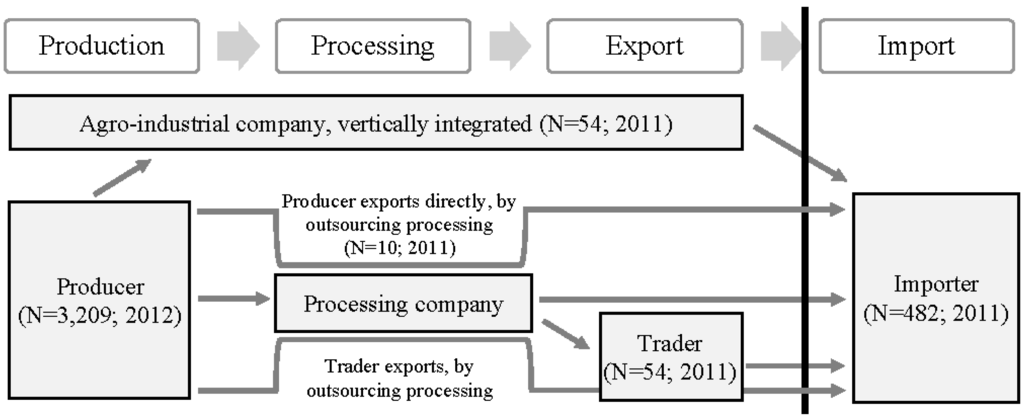 Peruvian asparagus value chain (Sources: Data on farmers: INEI [36]; Data on exporters and importers: SUNAT [32]; Subdivision of exporters into vertically integrated, only producing, only processing company or trader: company survey by Schuster and Maertens [35,37]).